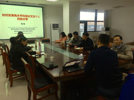 桂教授就如何发表高水平科技论文及个人发表论文的经验与大家进行了分享。桂冠教授所在的南京邮电大学开放计算与普适感知研究中心(FOCUSLAB)主要研究方向为无线通信,大数据与人工智能,每年发表的高水平科技论文居南京邮电大学首位。老师们就自己关心的研究方向与论文发表问题与桂教授进行了认真热烈的讨论。讨论会还就网通学院与该实验室下一步的合作创新进一步明确了任务与目的。