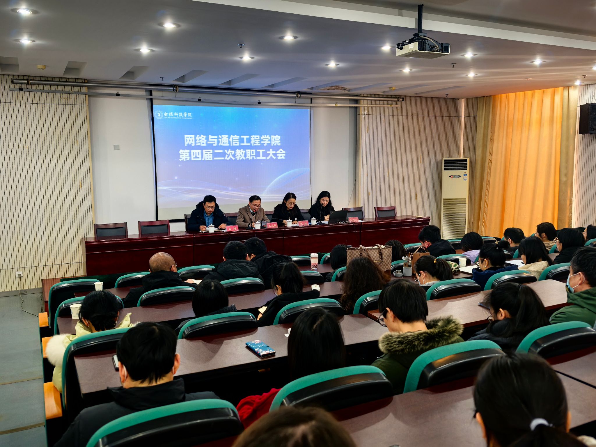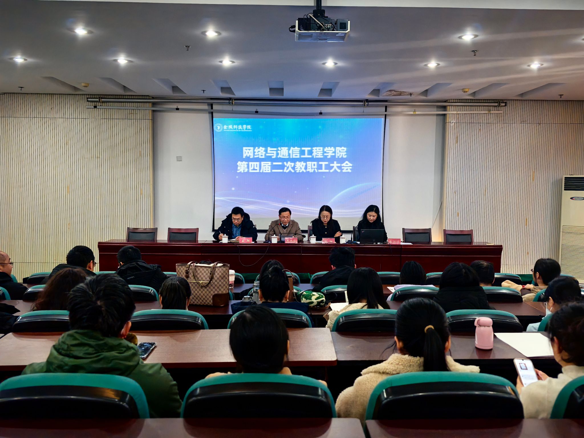 2025年1月15日下午13:30,太阳集团tyc539macau在金科宾馆3204召开四届二次教职工大会,大会主题为“与时俱进 创新发展 共创网通美好明天”。学院党政领导及全院教职工参加了大会,工会主席朱湉湉主持会议。大会在庄严的国歌声中开幕。