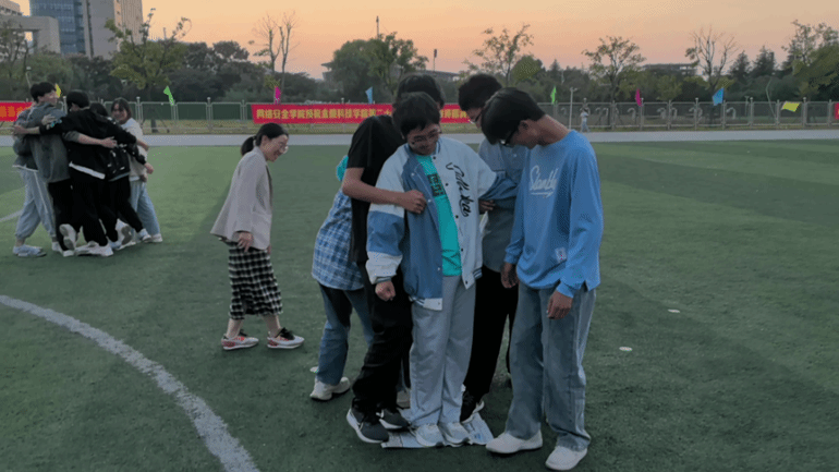 活动分为“认识你真好”、“团体雕塑”、“团结就是力量”、“蜈蚣竞走”、“汪洋中的一条船”五个环节,在“认识你真好”环节,各组同学介绍自己的基本信息和兴趣爱好,打破了陌生感,为后续的团队合作奠定基础。在“团体雕塑”环节中,各组以“家”为主题,通过身体元素创造独具特色的作品,鼓励大家通过团队合作提升创造力和凝聚力。在“团结就是力量”环节中,小组成员背靠背坐在草地上,并互相支持、互相依靠从地上站起来,让组员感受到了团结带来的力量和成就感。在“蜈蚣竞走”环节中,各组成员依次排好队蹲下并抱住前一个人的肚子开始行走,锻炼了同学们的团队协作能力。最后,“汪洋中的一条船”环节让组员努力站在一张报纸上,鼓励大家面对挑战和困难时团结一心、同舟共济。