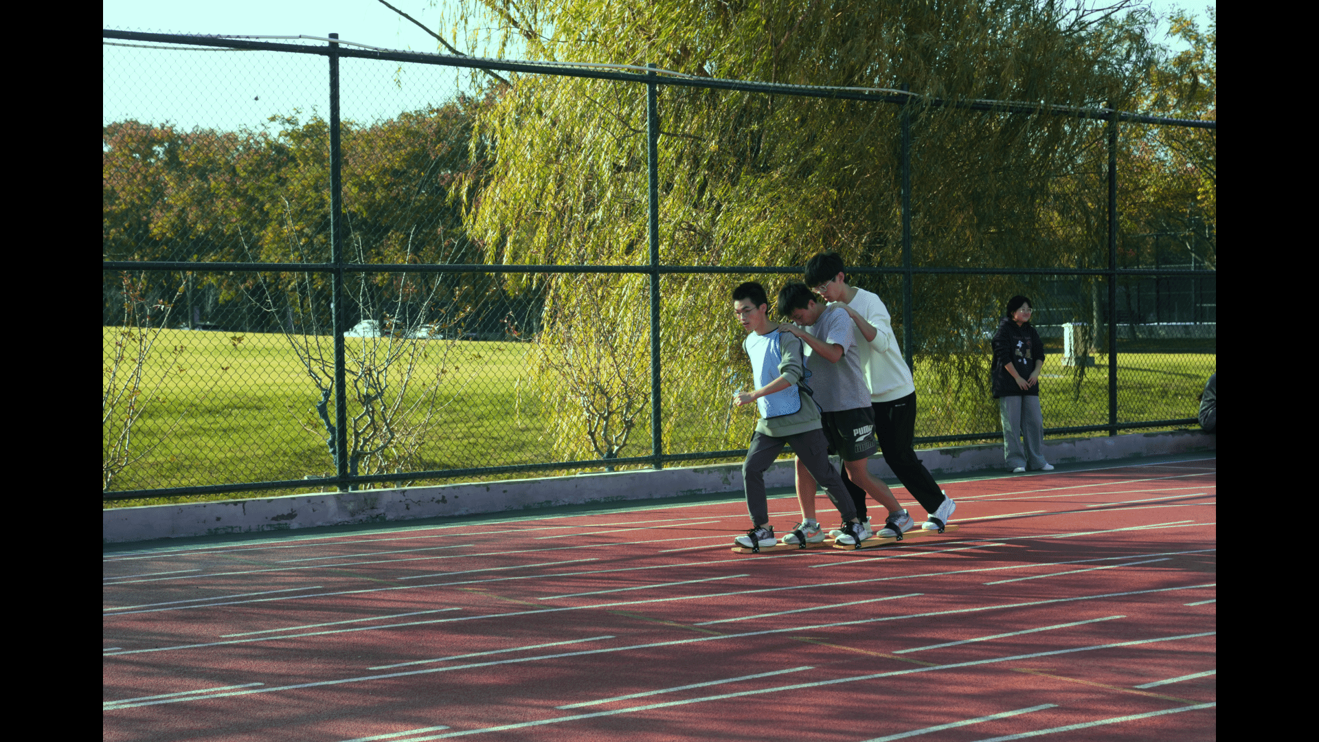 本次运动会共设民族健身操、板鞋竞速、投壶、锤丸、蹴鞠、射艺六个项目,开幕式过后,各项目紧锣密鼓地展开。投壶时,张佳诚同学屏气凝神,将箭矢稳稳投入壶中;捶丸现场,何美玥同学专注瞄准,挥杆击球,小球在场地滚动;射艺区内,顾梦洁同学拉弓搭箭,利箭如流星般精准射向靶心,整个过程充满了传统运动的独特韵味与竞技魅力。最精彩的板鞋竞速项目中,田梁伟、李冒辉、胡子强等人同穿一双板鞋,配合默契地大步向前,在跑道上如同一道紧密相连的闪电,奋力向终点冲刺,场外加油声此起彼伏,气氛热烈。