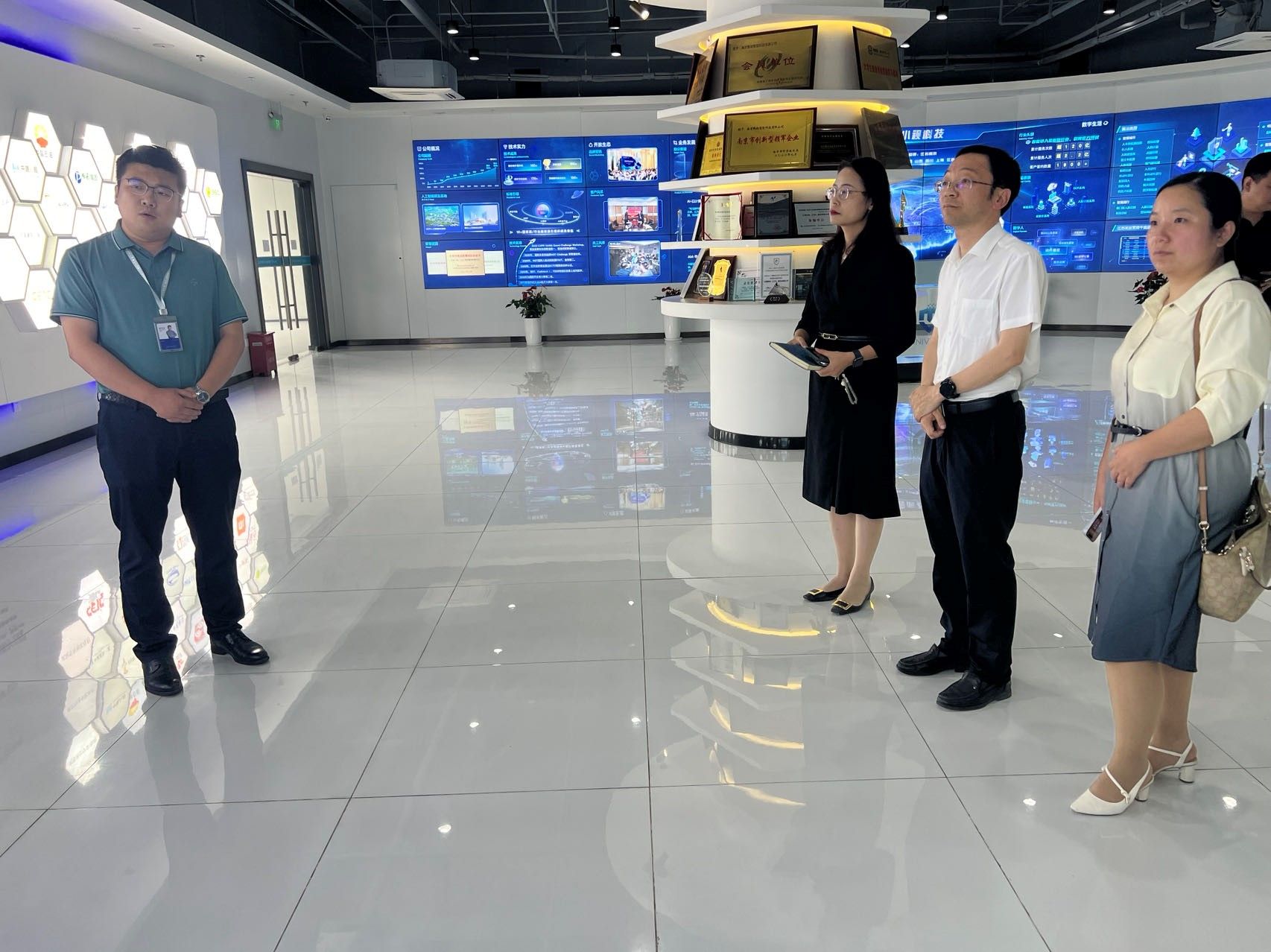 小视科技杨帆董事长、周守业副总经理对我院一行人的到访表示热烈的欢迎,并陪同参观了小视科技的展厅。周守业经理详细介绍了小视科技的发展历程、开放生态以及企业在数字城市、数字产业、数字生活场景提供的主要数字服务等,展示了企业人工智能领域的领先地位与实力。