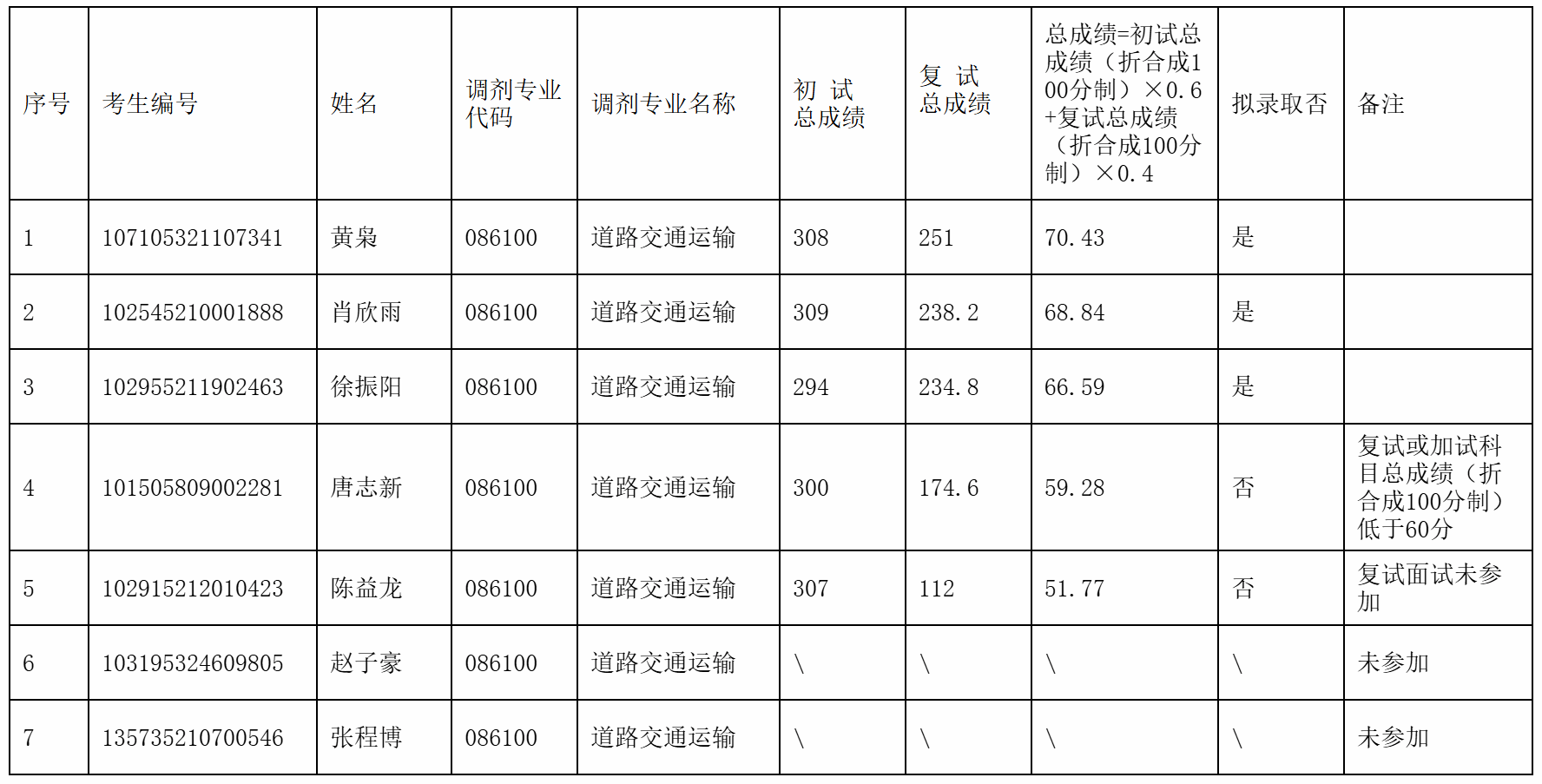 附:太阳集团tyc5392025年交通运输专硕点调剂复试(二)拟录取名单